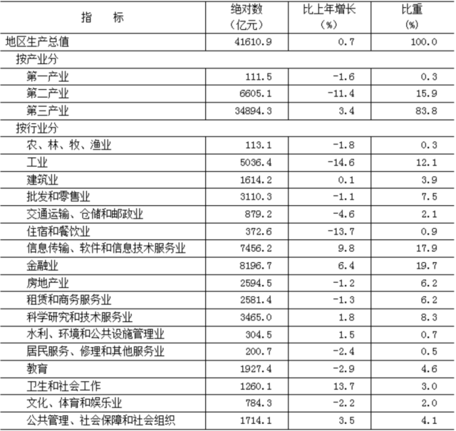 初步核算,全年實現(xiàn)地區(qū)生產總值41610.9億元,按不變價格計算,比上年增長0.7%。其中,第一產業(yè)[2]增加值111.5億元,下降1.6%;第二產業(yè)增加值6605.1億元,下降11.4%;第三產業(yè)增加值34894.3億元,增長3.4%。三次產業(yè)構成為0.3︰15.9︰83.8。按常住人口計算,全市人均地區(qū)生產總值為19.0萬元。