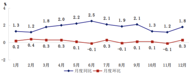全年居民消費價格總水平比上年上漲1.8%。工業(yè)生產者出廠價格上漲2.3%,工業(yè)生產者購進價格上漲6.2%。農產品生產者價格上漲2.7%。12月份,新建商品住宅銷售價格環(huán)比指數(shù)為100.2、同比指數(shù)為105.8;二手住宅銷售價格環(huán)比指數(shù)為99.6、同比指數(shù)為103.9。