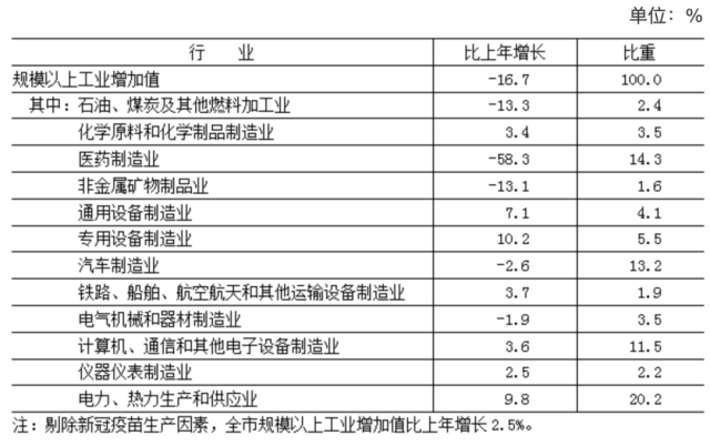 全年實現(xiàn)工業(yè)增加值5036.4億元,按不變價格計算,比上年下降14.6%。其中,規(guī)模以上工業(yè)[4]增加值下降16.7%,剔除新冠疫苗生產因素增長2.5%。在規(guī)模以上工業(yè)中,電力、熱力生產和供應業(yè)增長9.8%,計算機、通信和其他電子設備制造業(yè)增長3.6%,汽車制造業(yè)下降2.6%,醫(yī)藥制造業(yè)下降58.3%(剔除新冠疫苗生產因素后增長6.4%)。規(guī)模以上工業(yè)實現(xiàn)銷售產值22366.3億元,下降5.7%。其中,內銷產值20560.5億元,下降1.8%;出口交貨值1805.8億元,下降35.0%。