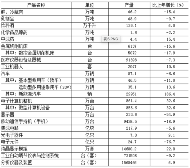表6 2022年規(guī)模以上工業(yè)企業(yè)主要產品產量