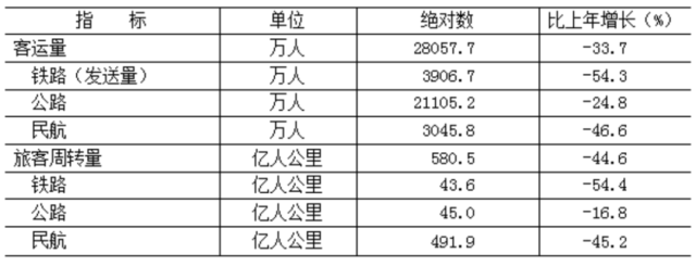 全年貨運量24037.4萬噸,比上年下降14.5%;貨物周轉量881.5億噸公里,增長0.1%。全年客運量28057.7萬人,下降33.7%;旅客周轉量580.5億人公里,下降44.6%。