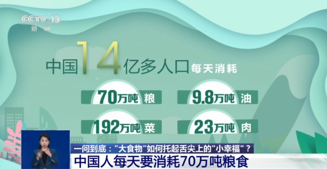 中國(guó)農(nóng)業(yè)科學(xué)院研究員 國(guó)家食物與營(yíng)養(yǎng)咨詢委員會(huì)主任 陳萌山:過去我們吃飯,主要是主糧,一大碗米飯或者一點(diǎn)咸菜,一點(diǎn)辣椒。那么現(xiàn)在不一樣了,我們一小碗米飯很多菜,不僅僅是主食,副食老百姓要求更高。我們講直接消費(fèi)的口糧,已經(jīng)由1978年的人均248公斤,下降到目前的130公斤,所以副食也成為主食了。為了適應(yīng)這樣一個(gè)新的形勢(shì),總書記提出“大食物觀”。