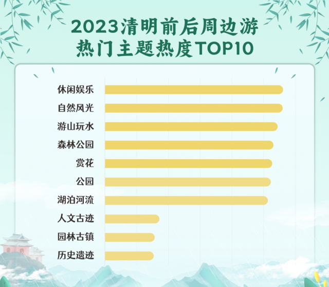 據(jù)某旅游票務(wù)平臺(tái)發(fā)布的《2023清明假期出游趨勢(shì)報(bào)告》,清明期間,本地及周邊短途出游是主流,出游主題上具有顯著的春游季特征。《報(bào)告》顯示,清明假期(4月5日)前后周邊游的熱門主題按照熱度排序依次為休閑娛樂、自然風(fēng)光、游山玩水、森林公園、賞花、公園等。前十個(gè)熱門主題中,具有賞花踏青屬性的主題占據(jù)了六席。