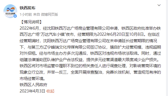 央視網(wǎng)消息:據(jù)@鐵西發(fā)布 微博4月3日消息,鐵西區(qū)人民政府發(fā)布情況說明。2022年6月,經(jīng)沈陽鐵西萬達(dá)廣場商業(yè)管理有限公司申請,鐵西區(qū)政府批準(zhǔn)舉辦鐵西萬達(dá)廣場“萬達(dá)汽車小鎮(zhèn)”夜市,經(jīng)營期限為2022年6月20日至10月8日。在臨近經(jīng)營期滿時,沈陽鐵西萬達(dá)廣場商業(yè)管理有限公司在未申請延長經(jīng)營期限的情況下,與第三方遼寧峰瑞文化傳媒有限公司簽訂協(xié)議,擅自擴大經(jīng)營規(guī)模,違規(guī)超期對外招租。經(jīng)與市場主辦方多次溝通后,鐵西區(qū)對違規(guī)市場依法取締。同時,通過組建法律援助團(tuán)隊維護(hù)業(yè)戶合法權(quán)益,提供多元經(jīng)營渠道最大限度減少業(yè)戶損失。