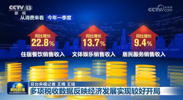 從消費來看,一季度,住宿餐飲、文體娛樂、居民服務等銷售收入同比分別增長22.8%、13.7%和9.4%,回升較為明顯,潛力加快釋放。