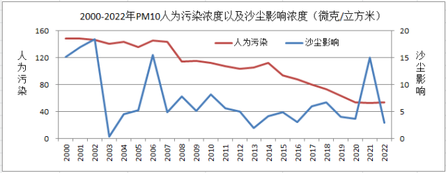 2000-2022年P(guān)M10人為污染濃度以及沙塵影響濃度變化圖。圖片來源:北京市生態(tài)環(huán)境監(jiān)測中心