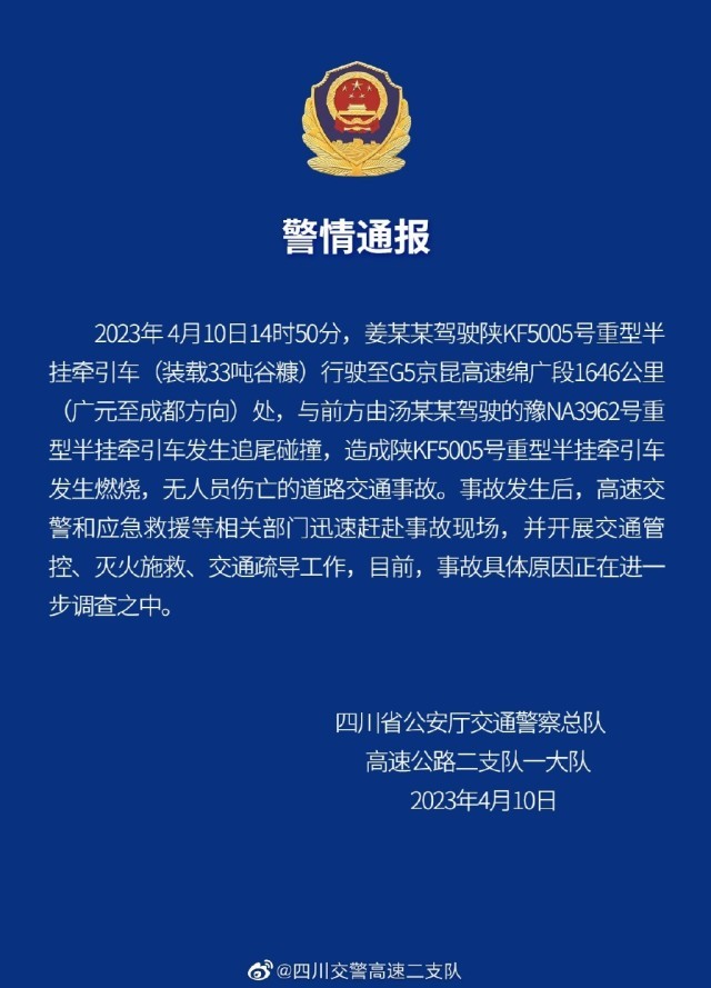 央視網(wǎng)消息:據(jù)@四川交警高速二支隊(duì)微博通報(bào),4月10日14時(shí)50分,姜某某駕駛陜KF5005號(hào)重型半掛牽引車(裝載33噸谷糠)行駛至G5京昆高速綿廣段1646公里(廣元至成都方向)處,與前方由湯某某駕駛的豫NA3962號(hào)重型半掛牽引車發(fā)生追尾碰撞,造成陜KF5005號(hào)重型半掛牽引車發(fā)生燃燒,無人員傷亡的道路交通事故。事故發(fā)生后,高速交警和應(yīng)急救援等相關(guān)部門迅速趕赴事故現(xiàn)場,并開展交通管控、滅火施救、交通疏導(dǎo)工作,目前,事故具體原因正在進(jìn)一步調(diào)查之中。