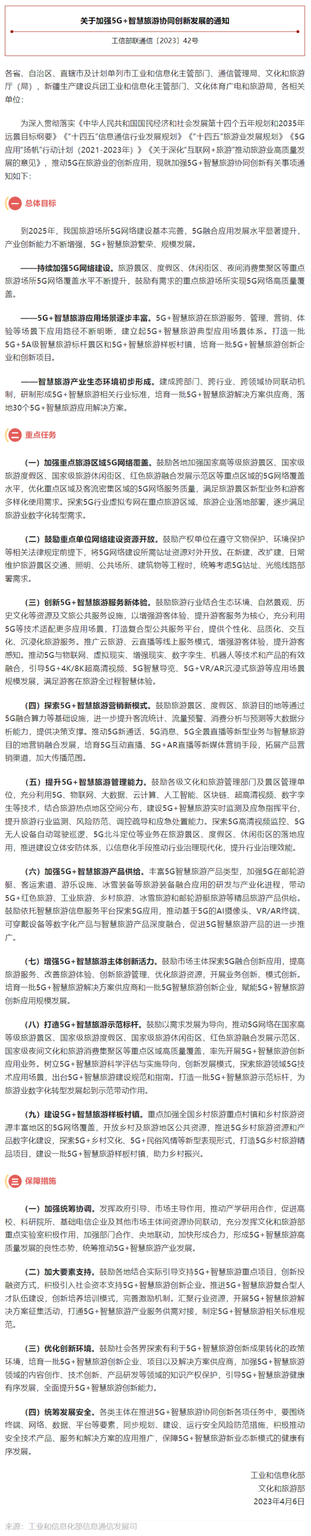 據(jù)“工信微報”公眾號消息,為深入推進(jìn)5G在旅游業(yè)的創(chuàng)新應(yīng)用,賦能旅游業(yè)數(shù)字化、網(wǎng)絡(luò)化、智能化轉(zhuǎn)型升級,培育發(fā)展智慧旅游新業(yè)態(tài)、新模式,推動5G智慧旅游協(xié)同創(chuàng)新發(fā)展,工業(yè)和信息化部聯(lián)合文化和旅游部印發(fā)《關(guān)于加強(qiáng)5G+智慧旅游協(xié)同創(chuàng)新發(fā)展的通知》。
