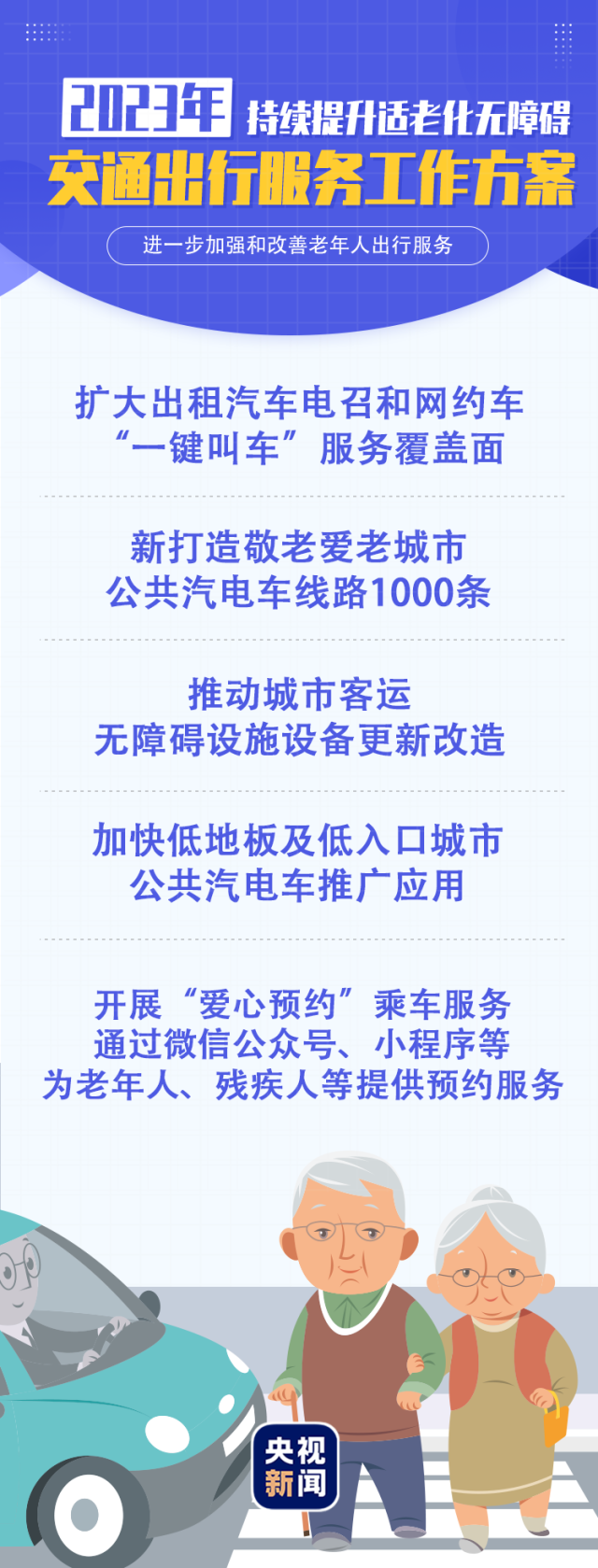 《2023年持續(xù)提升適老化無障礙交通出行服務(wù)工作方案》提出多項目標(biāo)任務(wù),滿足廣大老年人無障礙出行服務(wù)需要。