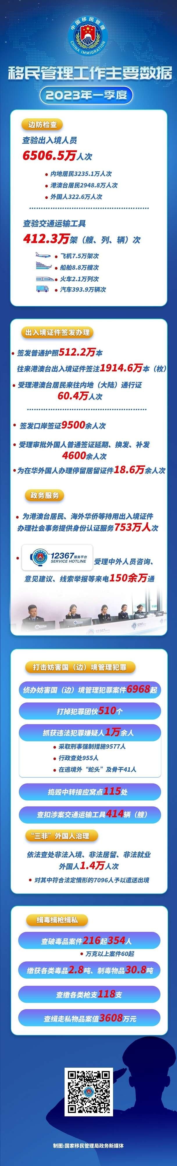 一季度,全國(guó)移民管理機(jī)構(gòu)查驗(yàn)交通運(yùn)輸工具412.3萬(wàn)架(艘、列、輛)次,其中飛機(jī)7.5萬(wàn)架次,船舶8.8萬(wàn)艘次,火車(chē)2.1萬(wàn)列次,汽車(chē)393.9萬(wàn)輛次;簽發(fā)普通護(hù)照512.2萬(wàn)本、往來(lái)港澳臺(tái)出入境證件簽注1914.6萬(wàn)本(枚),受理港澳臺(tái)居民來(lái)往內(nèi)地(大陸)通行證60.4萬(wàn)人次;簽發(fā)口岸簽證9500余人次,受理審批外國(guó)人普通簽證延期、換發(fā)、補(bǔ)發(fā)4600余人次,為在華外國(guó)人辦理停留居留證件18.6萬(wàn)余人次;為港澳臺(tái)居民、海外華僑等持用出入境證件辦理社會(huì)事務(wù)提供身份認(rèn)證服務(wù)753萬(wàn)人次,12367服務(wù)平臺(tái)受理中外人員咨詢、意見(jiàn)建議、線索舉報(bào)等來(lái)電150余萬(wàn)通。