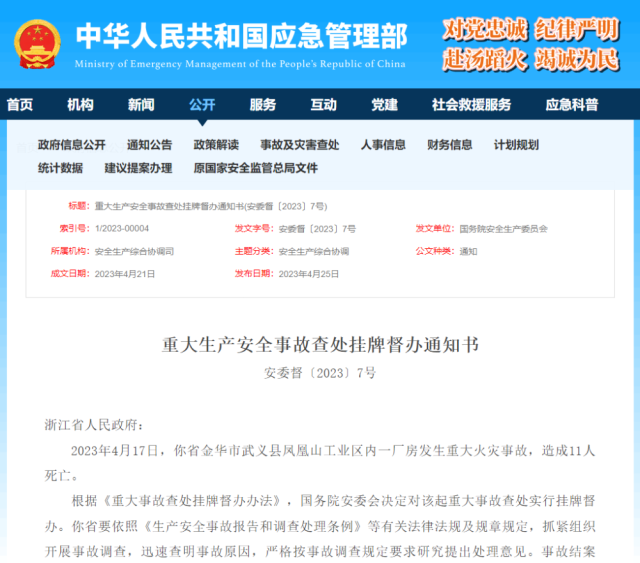 2023年4月17日,你省金華市武義縣鳳凰山工業(yè)區(qū)內(nèi)一廠房發(fā)生重大火災(zāi)事故,造成11人死亡。
