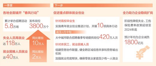 保重點,促進重點群體就業(yè)創(chuàng)業(yè)。針對高校畢業(yè)生,將實施促進高校畢業(yè)生等青年就業(yè)創(chuàng)業(yè)推進計劃,開展10項具體行動,著力拓展就業(yè)渠道、做實做細就業(yè)服務(wù)、強化困難兜底保障。截至4月中旬,大中城市聯(lián)合招聘春季專場提供崗位420萬人次。針對農(nóng)民工、就業(yè)困難人員,將組建勞務(wù)協(xié)作聯(lián)盟,健全跨區(qū)域信息共享和勞務(wù)輸出機制。加強困難群體就業(yè)兜底幫扶,確保零就業(yè)家庭至少有一人就業(yè)。