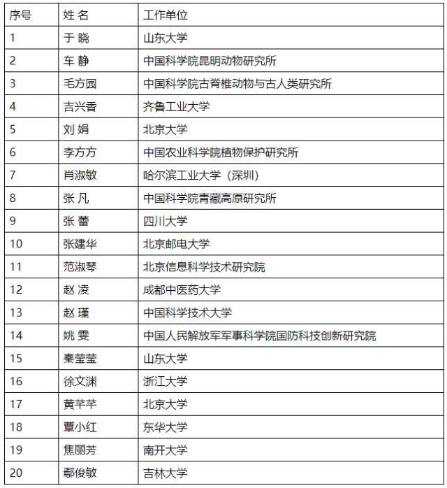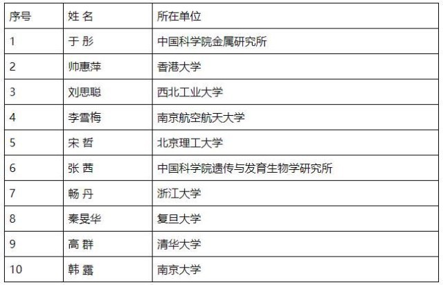 第十八屆中國青年女科學家獎獲獎者名單