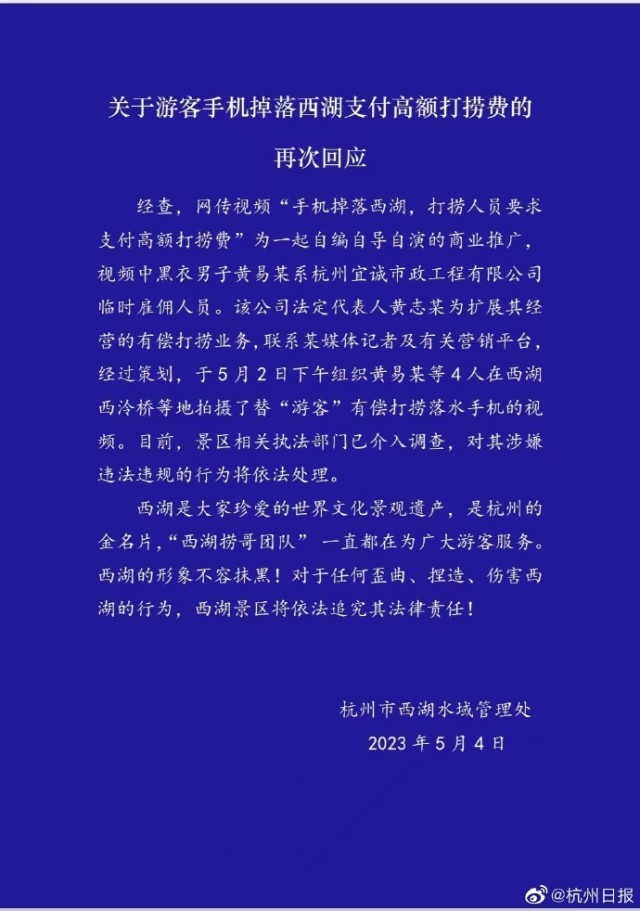 5月4日,杭州西湖水域管理處再次回應(yīng)“高價(jià)撈手機(jī)事件”:經(jīng)查,網(wǎng)傳視頻“手機(jī)掉落西湖,打撈人員要求支付高額打撈費(fèi)”為一起自編自導(dǎo)自演的商業(yè)推廣,視頻中黑衣男子黃易某系杭州宜誠市政工程有限公司臨時(shí)雇傭人員。該公司法定代表人黃志某為擴(kuò)展其經(jīng)營的有償打撈業(yè)務(wù),聯(lián)系某媒體記者及有關(guān)營銷平臺(tái)經(jīng)過策劃,于5月2日下午組織黃易某等4人在西湖西冷橋等地拍攝了替“游客”有償打撈落水手機(jī)的視頻。目前,景區(qū)相關(guān)執(zhí)法部門已介入調(diào)查,對其涉嫌違法違規(guī)的行為將依法處理。西湖是大家珍愛的世界文化景觀遺產(chǎn),是杭州的金名片,“西湖撈哥團(tuán)隊(duì)”一直都在為廣大游客服務(wù)。西湖的形象不容抹黑!對于任何歪曲、捏造、傷害西湖的行為,西湖景區(qū)將依法追究其法律責(zé)任!