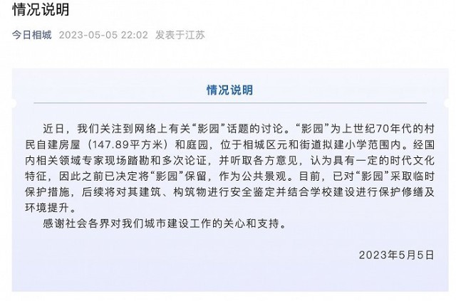 央視網(wǎng)消息:蘇州相城區(qū)委宣傳部公眾號“今日相城”5月5日發(fā)布情況說明稱,近日關(guān)注到網(wǎng)絡(luò)上有關(guān)“影園”話題的討論。“影園”為上世紀70年代的村民自建房屋(147.89平方米)和庭園,位于相城區(qū)元和街道擬建小學(xué)范圍內(nèi)。經(jīng)國內(nèi)相關(guān)領(lǐng)域?qū)<椰F(xiàn)場踏勘和多次論證,并聽取各方意見,認為具有一定的時代文化特征,因此之前已決定將“影園”保留,作為公共景觀。目前,已對“影園”采取臨時保護措施,后續(xù)將對其建筑、構(gòu)筑物進行安全鑒定并結(jié)合學(xué)校建設(shè)進行保護修繕及環(huán)境提升。