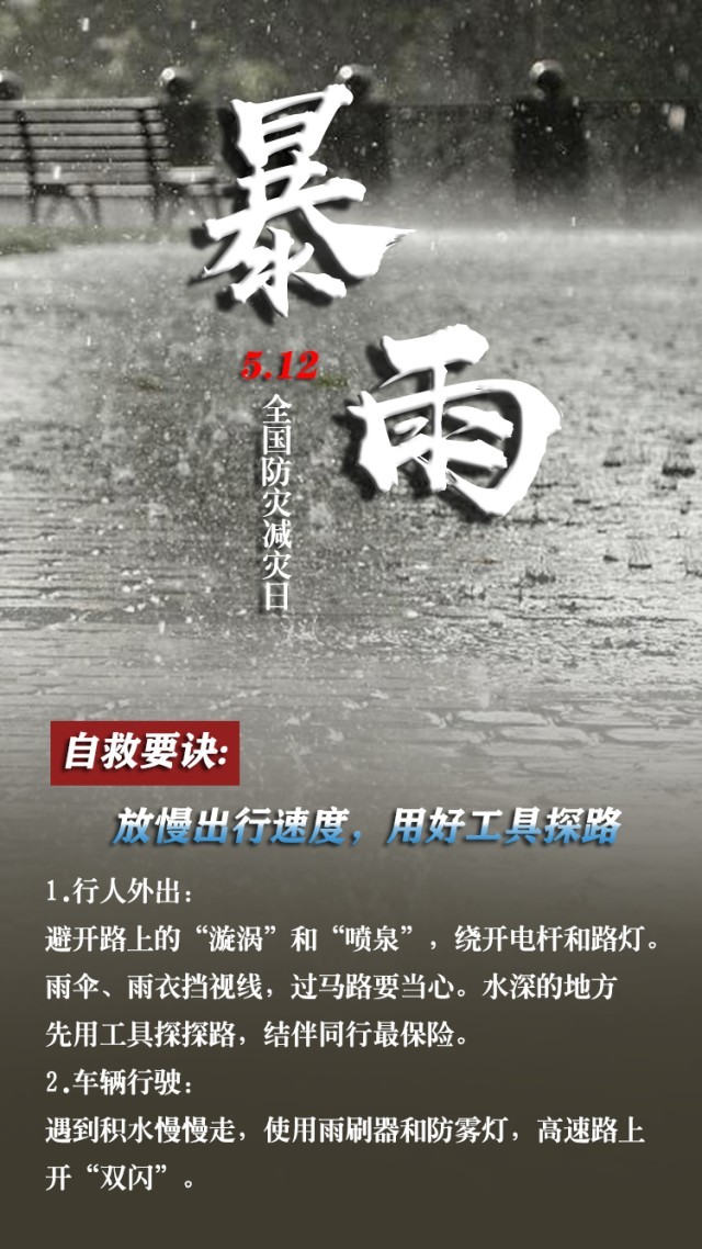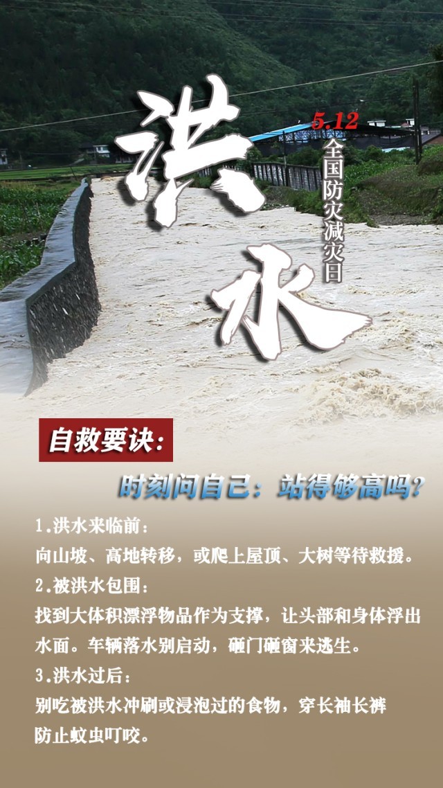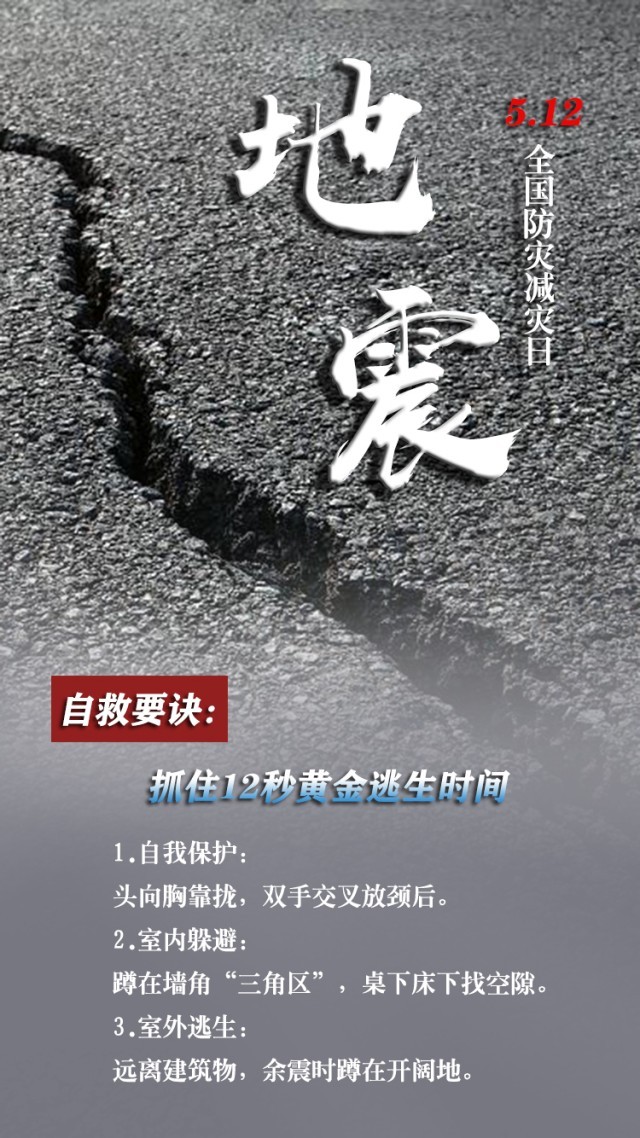 今天是第15個(gè)全國防災(zāi)減災(zāi)日。自然災(zāi)害隨時(shí)可能發(fā)生,及時(shí)自救才更有生存希望。地震來時(shí),如何抓住12秒黃金逃生時(shí)間?發(fā)生火災(zāi)時(shí),如何躲避火場(chǎng)濃煙?暴雨天如何安全出行?沙塵天氣如何做好防護(hù)……這份實(shí)用避險(xiǎn)口訣簡(jiǎn)單好記,請(qǐng)速速收藏。