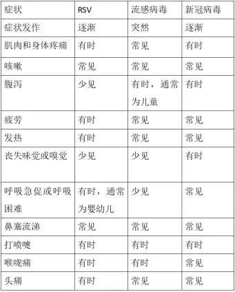 針對(duì)年初到現(xiàn)在流行的新冠病毒、甲型流感病毒和呼吸道合胞病毒,唐蘭芳解釋說(shuō),這三種病毒都是通過(guò)呼吸道傳播、且傳染性強(qiáng)的病毒,均會(huì)引起發(fā)熱、咳嗽及鼻塞流涕等癥狀,因此有時(shí)很難區(qū)分感染了哪種病毒,雖然這些病毒有不少相似的癥狀,但也有一些區(qū)別,如流感病毒感染潛伏期短,通常是突然發(fā)熱,高熱為主,而另外兩種則是逐漸發(fā)病,且呼吸道合胞病毒感染的患兒中腹瀉較為少見(jiàn),可以參考表格內(nèi)容,明確診斷的話建議行相關(guān)核酸或抗原檢測(cè)。