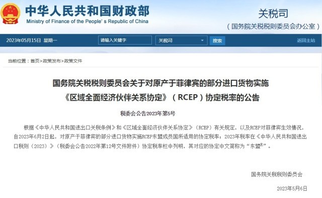 近日,《區(qū)域全面經濟伙伴關系協(xié)定》(RCEP)保管機構東盟秘書處發(fā)布通知,菲律賓已向東盟秘書長正式交存核準書。根據(jù)協(xié)定規(guī)定,RCEP將于2023年6月2日起對菲律賓正式生效。為嚴格履行協(xié)定承諾,積極推動RCEP全面生效實施,國務院關稅稅則委員會發(fā)布公告,自2023年6月2日起,對原產于菲律賓的部分進口貨物實施RCEP東盟成員國所適用的協(xié)定稅率,后續(xù)年度稅率自當年1月1日起實施。RCEP對菲律賓生效后,全部15個成員均完成生效程序,并相互實施關稅減讓,協(xié)定進入全面實施新階段。