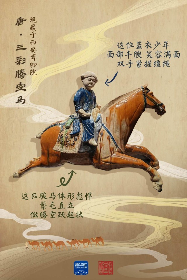 1000多年前,一位來(lái)自西域的“藍(lán)衣少年”,穿過(guò)茫茫戈壁、廣袤沙漠,抵達(dá)長(zhǎng)安。這位“藍(lán)衣少年”,是西安博物院“明星”藏品——唐代三彩騰空馬之上的騎手?!八?,也見(jiàn)證了這場(chǎng)跨越千年的文明交融。