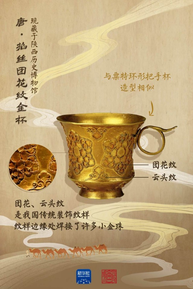 唐代部分帶把杯直接來(lái)自中亞粟特,還有部分屬于唐人仿制粟特風(fēng)格的作品。在打磨光滑的杯身上,焊接了四朵黃金質(zhì)地的細(xì)絲編成的團(tuán)花,即團(tuán)花紋;每朵團(tuán)花紋的間隙,還用同樣的制作方式焊接了像云朵一樣的紋飾,即云頭紋。團(tuán)花紋與云頭紋是我國(guó)傳統(tǒng)的吉祥圖案,此金杯也是東西方文明通過(guò)絲綢之路進(jìn)行交流互鑒的珍貴物證。