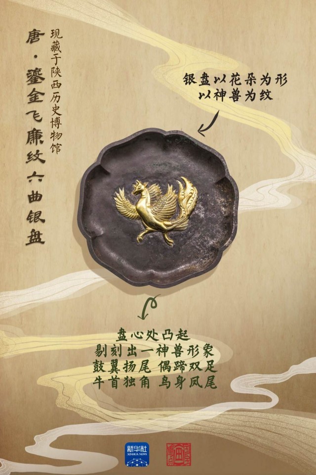 1970年10月,在西安市南郊何家村的工地上,施工人員偶然發(fā)現(xiàn)了一處文物窖藏,隨后在這里清理出千余件唐代珍寶。這件鎏金飛廉紋六曲銀盤(pán)制作考究、工藝典雅、紋飾獨(dú)特,盤(pán)心的神獸形象為飛廉,是中國(guó)古代神話傳說(shuō)中的風(fēng)神。這件銀盤(pán)構(gòu)圖借鑒了中亞粟特的藝術(shù)手法,但題材卻是中國(guó)紋樣,反映出唐代工匠在借鑒西方金銀器藝術(shù)的基礎(chǔ)上,更加注重推陳出新。