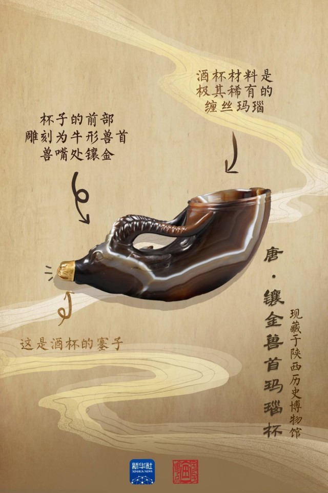 這件鑲金獸首瑪瑙杯,被列為我國(guó)禁止出境的珍貴文物之一。角狀杯體由一整塊極為罕見(jiàn)的紅色纏絲瑪瑙雕琢而成,整個(gè)杯體高6.5厘米,長(zhǎng)15.6厘米,口徑5.6厘米,其造型與起源于古希臘的酒具“來(lái)通”相似,“來(lái)通”曾廣泛流行于中亞、西亞地區(qū),沿著絲綢之路不斷東傳進(jìn)入中國(guó)。