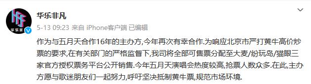 5月13日,華樂非凡在官方微博發(fā)布聲明,五月天演唱會全部可售票是在有關(guān)部門的嚴格監(jiān)督下,分配至官方授權(quán)票務(wù)平臺公開銷售。然而對于這則聲明粉絲們并不買賬,評論區(qū)里有粉絲詢問“不可售”的票去哪兒了?