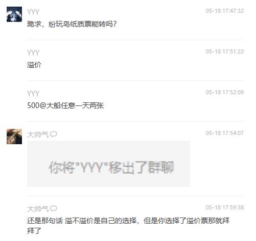 下一秒,群主現(xiàn)身并放出一張截圖,上面顯示求票的粉絲已被移除群聊。隨后群主寫道:“還是那句話,溢不溢價是自己的選擇,但是你選擇了溢價票那就拜拜了。”