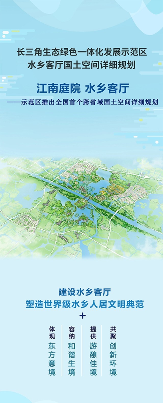 5月24日上午,在上海舉行了長(zhǎng)三角一體化示范區(qū)水鄉(xiāng)客廳國(guó)土空間詳細(xì)規(guī)劃新聞發(fā)布會(huì),會(huì)上發(fā)布了《長(zhǎng)三角生態(tài)綠色一體化發(fā)展示范區(qū)水鄉(xiāng)客廳國(guó)土空間詳細(xì)規(guī)劃(2021-2035年)》,這也是全國(guó)首個(gè)跨省域的國(guó)土空間詳細(xì)規(guī)劃。水鄉(xiāng)客廳國(guó)土空間詳細(xì)規(guī)劃共13章、45節(jié),并包含了42張圖集以及詳細(xì)圖則,未來(lái)示范區(qū)將如何建設(shè)水鄉(xiāng)客廳?一圖詳解