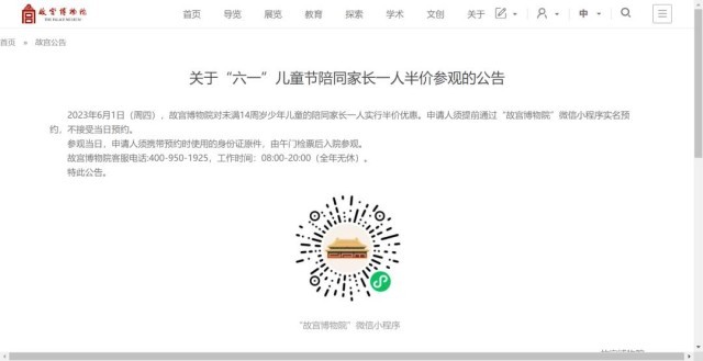故宮:“六一”帶未滿14歲兒童參觀,一名家長半價(jià)