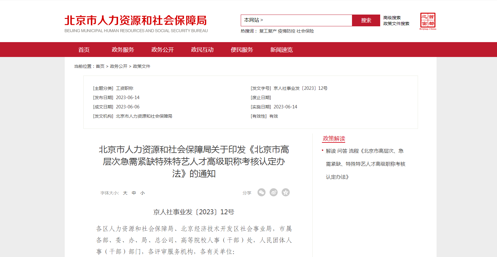 結(jié)合《關于進一步加強和改進職稱工作的通知》,北京還配套出臺了《北京市高層次、急需緊缺、特殊特藝人才高級職稱考核認定辦法》,作為北京現(xiàn)行職稱評價體系的有益補充。對取得重大基礎研究和前沿技術(shù)突破、解決重大工程技術(shù)難題或在經(jīng)濟社會各項事業(yè)中作出重大貢獻的專業(yè)技術(shù)人才,以及引進的高層次、急需緊缺、特殊特藝人才,可以采取“一事一議”“一人一策”的方式直接申報高級職稱,不拘一格“評”人才。