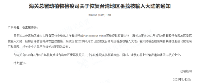 各海關(guān)自2023年6月20日起恢復受理臺灣地區(qū)番荔枝報關(guān),并依法依規(guī)實施檢驗檢疫。同時,請及時將上述情況通知轄區(qū)內(nèi)相關(guān)企業(yè)。