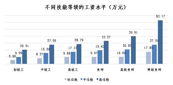 從工資中位數(shù)看,首席技師工資超初級(jí)工3倍。首席技師、特級(jí)技師、高級(jí)技師、技師、高級(jí)工、中級(jí)工和初級(jí)工分別為30.33萬(wàn)元、27.91萬(wàn)元、20.87萬(wàn)元、19.43萬(wàn)元、17.37萬(wàn)元、15.58萬(wàn)元和9.95萬(wàn)元。
