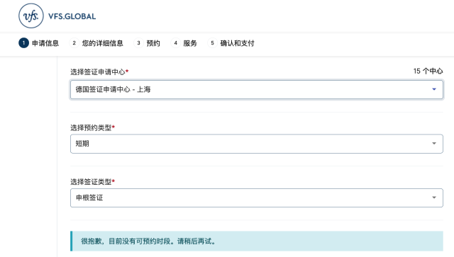 如在威孚仕官網(wǎng),在國內(nèi)多個城市的德國簽證申請中心申請短期申根簽證都顯示“目前沒有可預約時段”。