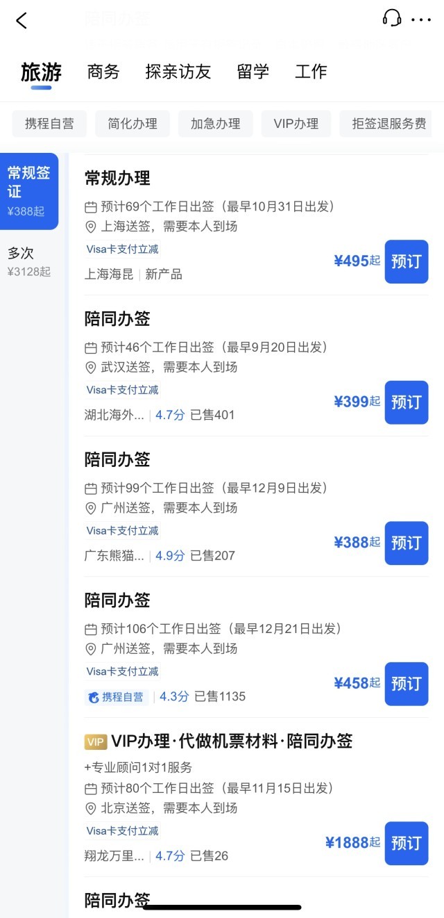 而在在線旅游平臺,以法國簽證為例,上海地區(qū)送簽常規(guī)辦理顯示最早10月31日出發(fā)。武漢送簽顯示最早9月20日出發(fā)。而廣州送簽則顯示最早出發(fā)時間在12月。
