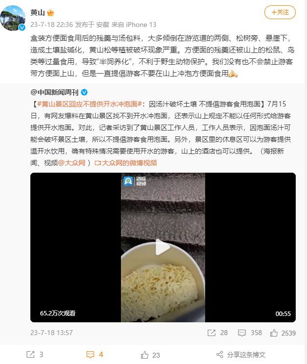 為何不提倡沖方便面?黃山景區(qū):殘羹破壞土壤,不利動(dòng)物保護(hù)