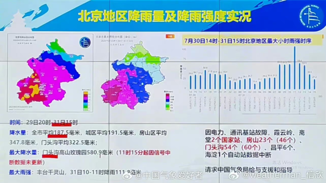 微博賬號“中國氣象愛好者”發(fā)布消息稱,北京西部大量氣象站因特大暴雨導致電力通信和設(shè)備故障失聯(lián) 來源:微博