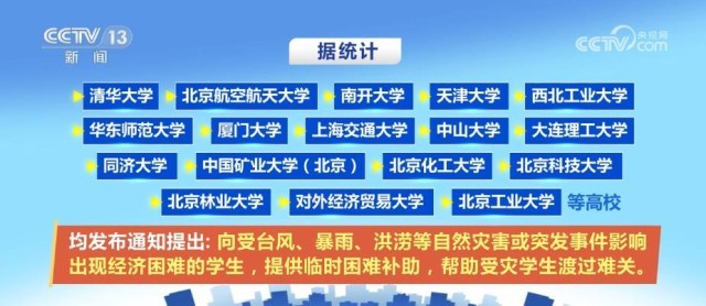 據(jù)統(tǒng)計,清華大學、北京航空航天大學、南開大學、天津大學、西北工業(yè)大學、華東師范大學、廈門大學、上海交通大學、中山大學、大連理工大學、同濟大學、中國礦業(yè)大學(北京)、北京化工大學、北京科技大學、北京林業(yè)大學、對外經(jīng)濟貿易大學、北京工業(yè)大學等高校均發(fā)布通知提出,向受臺風、暴雨、洪澇等自然災害或突發(fā)事件影響出現(xiàn)經(jīng)濟困難的學生,提供臨時困難補助,幫助受災學生渡過難關。