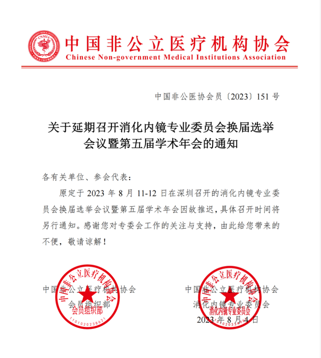 消化內(nèi)鏡專(zhuān)業(yè)委員會(huì)換屆選舉會(huì)議暨第五屆學(xué)術(shù)年會(huì)延期通知。圖片來(lái)源:中國(guó)非公立醫(yī)療機(jī)構(gòu)協(xié)會(huì)