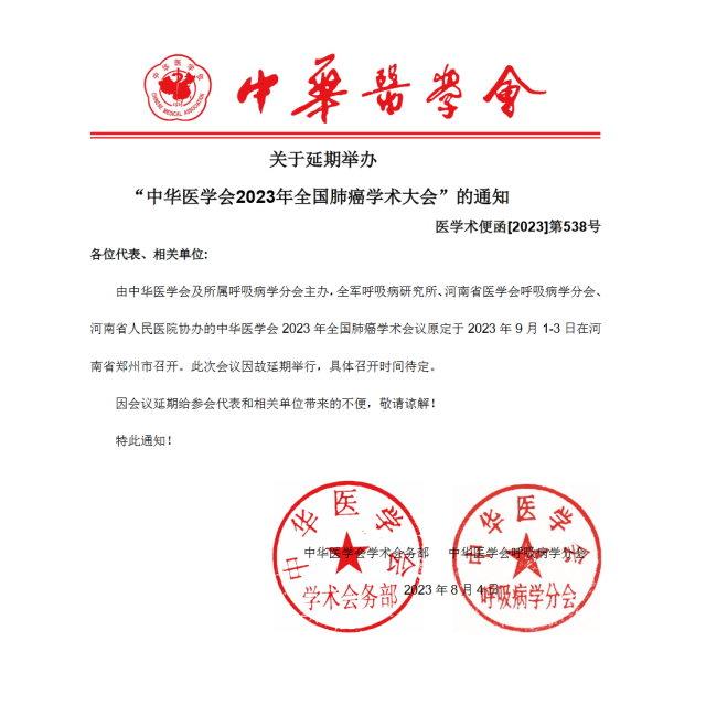 8月4日,中華醫(yī)學(xué)會(huì)2023年全國(guó)肺癌學(xué)術(shù)會(huì)議原定于2023年9月1-3日在河南省鄭州市召開(kāi),因故延期舉行,具體召開(kāi)時(shí)間待定。