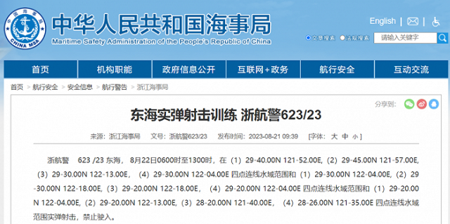 央視網(wǎng)消息:據(jù)中國海事局網(wǎng)站消息,浙江海事局發(fā)布航行警告,8月22日06時(shí)至13時(shí),東海部分水域范圍實(shí)彈射擊,禁止駛?cè)搿?/p>