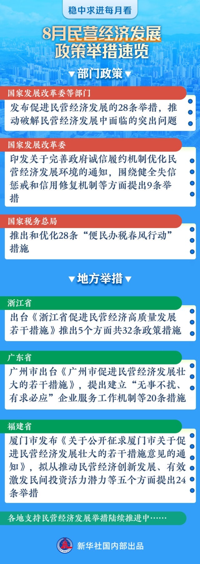 浙江省出臺(tái)促進(jìn)民營經(jīng)濟(jì)高質(zhì)量發(fā)展32條措施,提出向民營企業(yè)推介“三張項(xiàng)目清單”,為民間資本更好了解和參與重大項(xiàng)目提供平臺(tái);廣州市出臺(tái)促進(jìn)民營經(jīng)濟(jì)發(fā)展壯大的20條措施,提出建立“無事不擾、有求必應(yīng)”企業(yè)服務(wù)工作機(jī)制等;深圳市針對(duì)備受民營企業(yè)關(guān)注的放寬市場準(zhǔn)入、保護(hù)合法權(quán)益、清理拖欠企業(yè)賬款等方面,提出20條精準(zhǔn)有力舉措……