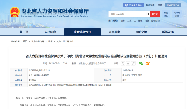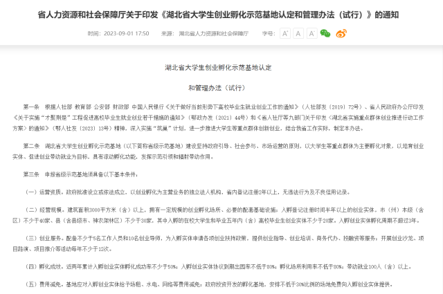 近日,記者從湖北省人力資源和社會保障廳獲悉,為進一步推進大學生等重點群體創(chuàng)新創(chuàng)業(yè),湖北省出臺《湖北省大學生創(chuàng)業(yè)孵化示范基地認定和管理辦法(試行)》并于發(fā)文之日開始執(zhí)行。