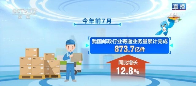 央視網(wǎng)消息:今年前7月,我國郵政行業(yè)寄遞業(yè)務量累計完成873.7億件,同比增長12.8%。其中,快遞業(yè)務量累計完成703億件,同比增長15.5%;國際/港澳臺快遞業(yè)務量累計完成16.1億件,同比增長57.2%。