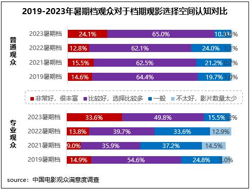 2023年7-8月新上映影片共80部,為近四年來同期最高值,滿意度調(diào)查的13部影片涵蓋劇情、動(dòng)畫、奇幻、懸疑、愛情、喜劇、動(dòng)作等多元類型,給觀眾帶來多樣化的觀影選擇。調(diào)研數(shù)據(jù)顯示,不同觀眾對(duì)于檔期觀影選擇空間均給予了好評(píng),普通觀眾、專業(yè)觀眾認(rèn)為檔期觀影選擇“非常好,很豐富”和“比較好,選擇比較多”的占比合計(jì)分別達(dá)89.2%、83.4%,均為近五年同期最高。
