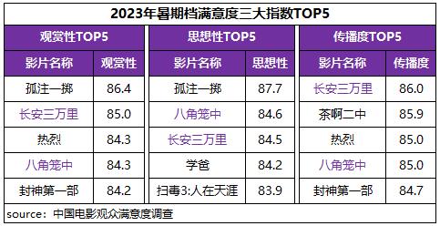 中國(guó)電影觀眾滿意度調(diào)查 2023年暑期檔調(diào)查結(jié)果顯示,暑期檔電影觀眾滿意度得分84.5分,較“五一”檔增長(zhǎng)1.2分。檔期豐富多元的影片內(nèi)容得到了觀眾的高滿意度評(píng)價(jià),調(diào)查的13部影片悉數(shù)進(jìn)入“滿意”區(qū)間(≥80分),有6部影片滿意度超84分,數(shù)量及占比居歷年同期之最。其中《孤注一擲》《長(zhǎng)安三萬里》分別以86.4分、85.1分為檔期滿意度單片冠亞軍,《八角籠中》《茶啊二中》《熱烈》和《封神第一部》四部影片滿意度均超84分。2023年暑期檔高滿意度佳作迭出,市場(chǎng)驚喜不斷,觀影氛圍持續(xù)火熱。