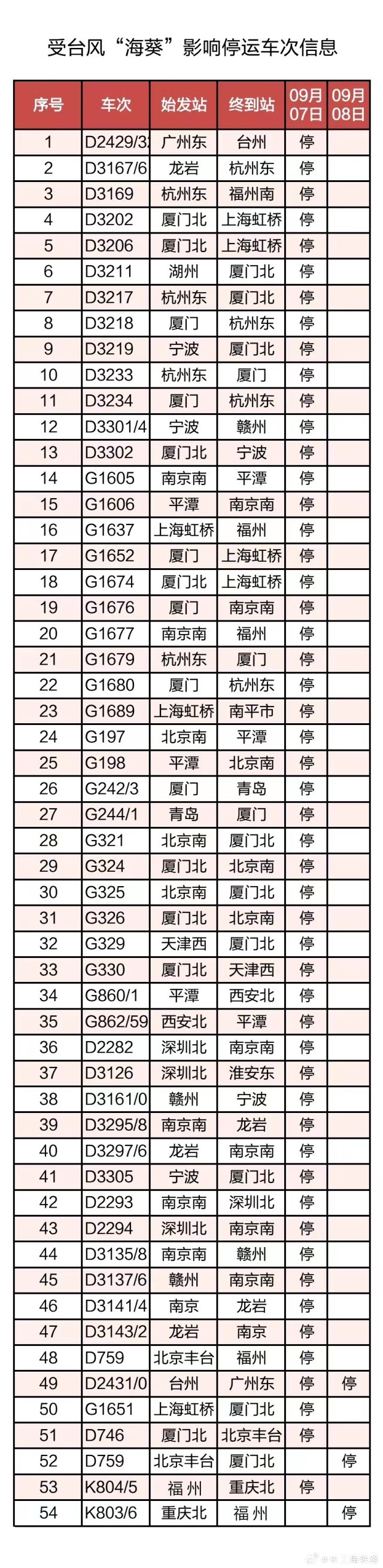 截至9月6日22時(shí),計(jì)劃停運(yùn)9月7日至9月8日間共54趟旅客列車:其中停運(yùn)動車組列車52趟,停運(yùn)普速列車2趟。