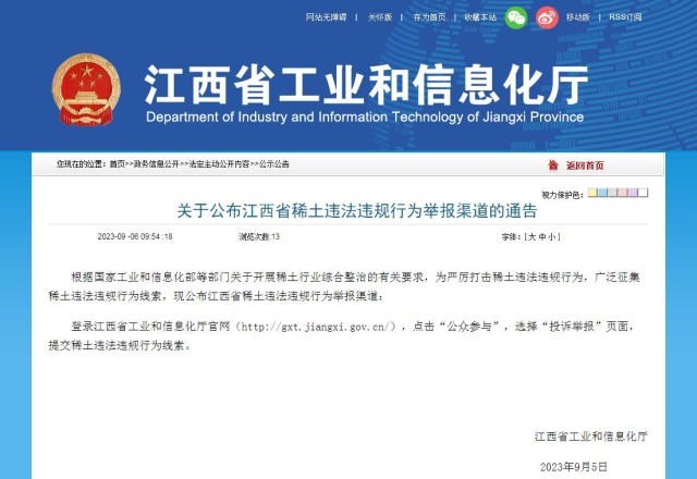 中新網(wǎng)9月6日電 據(jù)江西省工業(yè)和信息化廳官網(wǎng)6日消息,根據(jù)國家工業(yè)和信息化部等部門關于開展稀土行業(yè)綜合整治的有關要求,為嚴厲打擊稀土違法違規(guī)行為,廣泛征集稀土違法違規(guī)行為線索,現(xiàn)公布江西省稀土違法違規(guī)行為舉報渠道:登錄江西省工業(yè)和信息化廳官網(wǎng),點擊“公眾參與”,選擇“投訴舉報”頁面,提交稀土違法違規(guī)行為線索。
