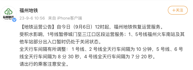央視網消息:據@福州地鐵 消息,自今日(9月6日)12時起,福州地鐵恢復運營服務。