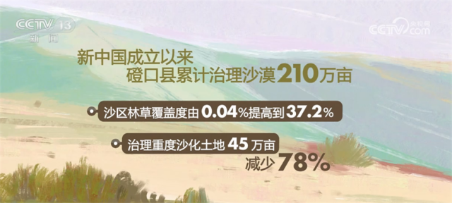 數(shù)據(jù)顯示,新中國成立以來,磴口縣累計治理沙漠210萬畝,沙區(qū)林草覆蓋度由0.04%提高到37.2%,治理重度沙化土地45萬畝,減少78%,向黃河年輸沙量減少到370萬噸,降低94.7%,沙漠治理呈現(xiàn)出“整體好轉、改善加速”的良好態(tài)勢,也因此形成了防沙治沙“磴口模式”。